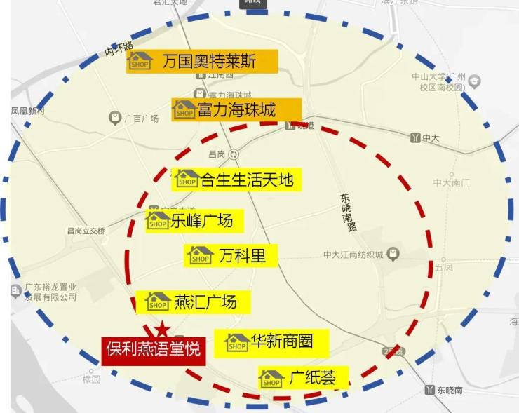 其中家门口工业大道中商圈(华新方圆333、燕汇广场、江燕路万科里、海珠合生生活天地等),5分钟可达江南西商圈(广百广场、富力海珠城等),达宝业路商圈(乐峰广场、宝业路美食街等),太古仓商圈等大型商圈。