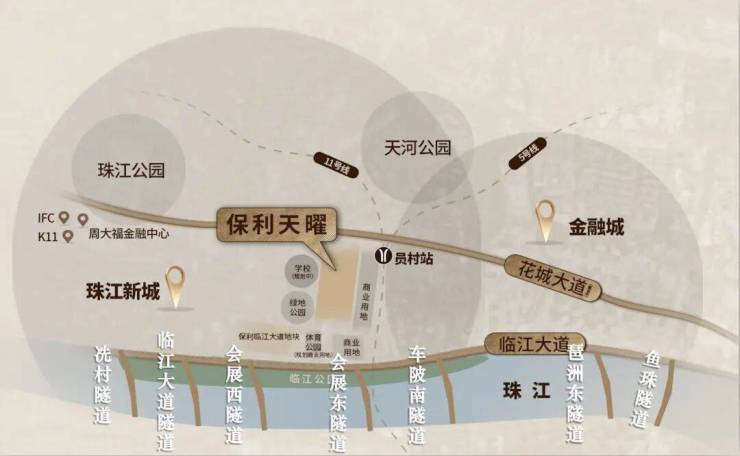 珠城-金融城(东西向):项目北侧花城大道规划东扩南移,项目南侧临江大道隧道已通车