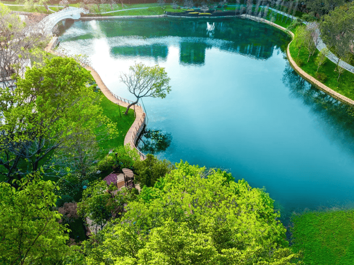 ▸丰厚的湖景资源,环抱映辰湖东西跨度近300米,离湖最近处约40米,专门开辟了私家步道与映辰湖直接相连