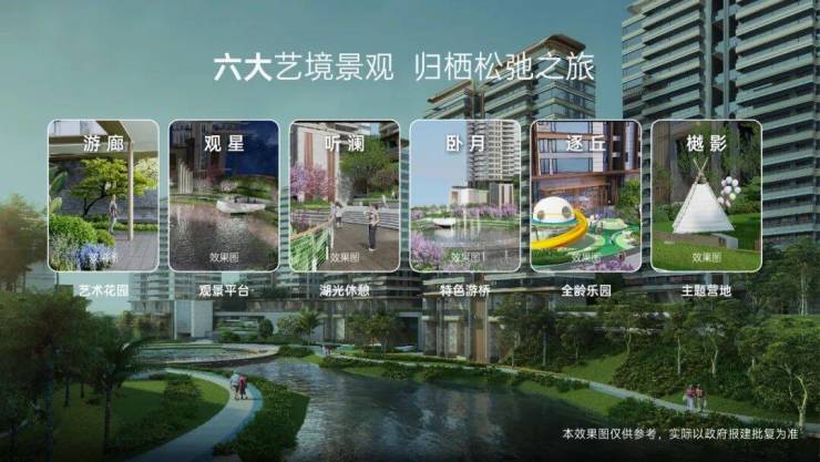 项目规划上千万的资金投入,只为给业主打造一个约2.6万㎡的内湖公园,湖内设有专业的水体净化系统、养殖水生植物,保障湖水常年清澈,达到观赏性水质标准;同时,沿湖打造6大艺境景观,构筑社区灵魂。