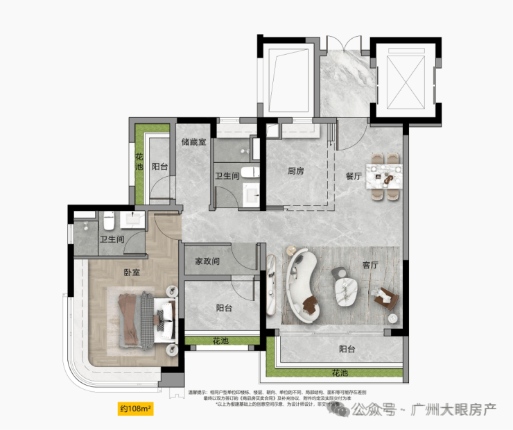 “宽幕视野” 南北通透双视野,主卧270°转角飘窗