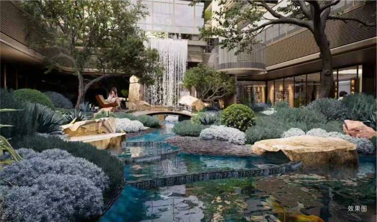 飞瀑下沉庭院:“小中见大、藏景藏意”,飞瀑、叠石、流水、绿植错落排布,流动的水景与静谧的山石相映,既为赏景绝佳之地,更是调节家庭气场、滋养身心的秘境。