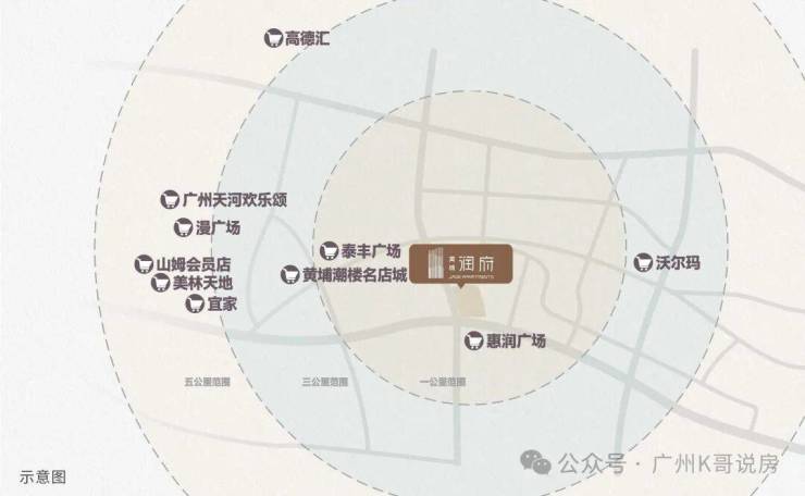 北面一路之隔是原黄埔区政府,直线约600米到保利中央公馆、黄埔体育馆;东面是万科城市之光,它就是位于惠润广场正对面的新溪旧改。