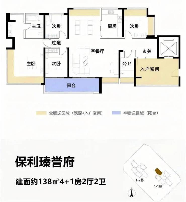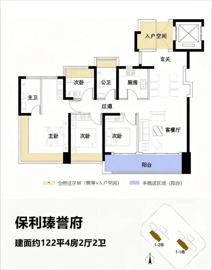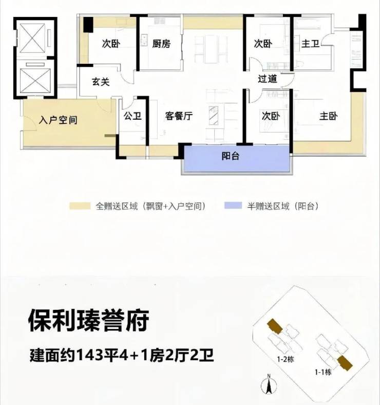 4梯5户带独立电梯厅,面积为114-122-138-143㎡,最大使用率108%,最大赠送面积接近44㎡。