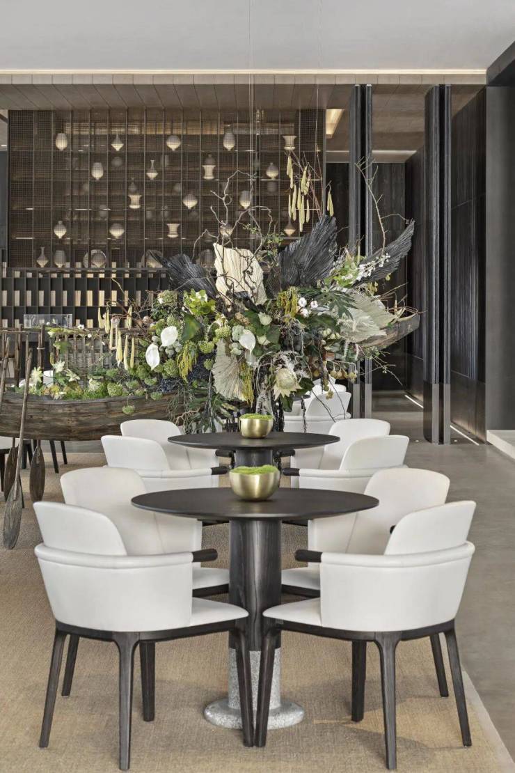 逛花市作為當地的傳統民俗盛會,屬於文化傳承的重要組成部分。設計於此出發,將這一傳統習俗濃縮到洽談區,並結合漁舟唱晚的語義表達,實現傳統民俗進入室內。