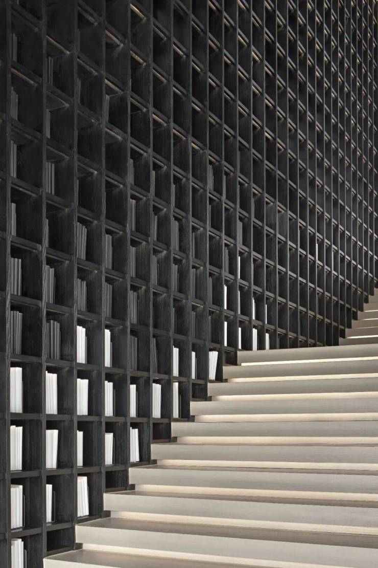 建築一二層的架構,設計使用旋轉樓梯承接起一二層空間的轉圜。此外,設計還從書吧區開鑿出一條通往二層的階梯,同樣打造出雙通道的銜接,暢通動線設置。