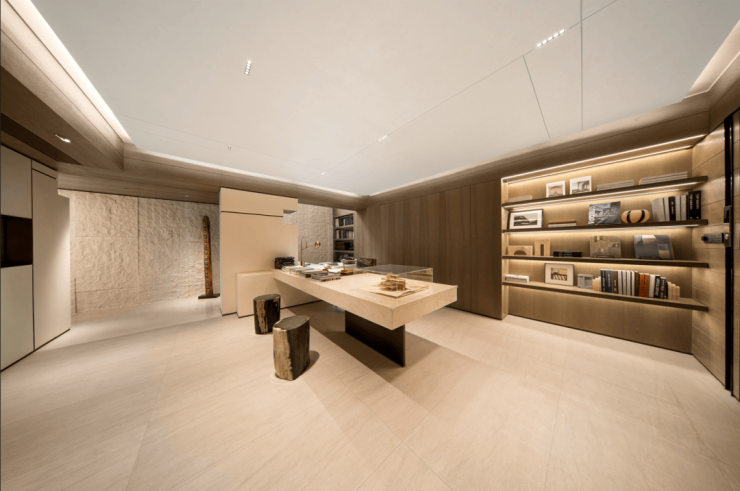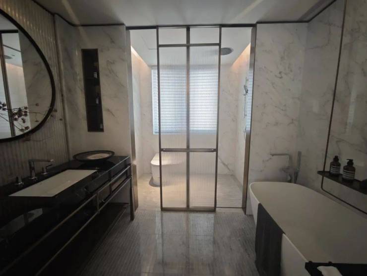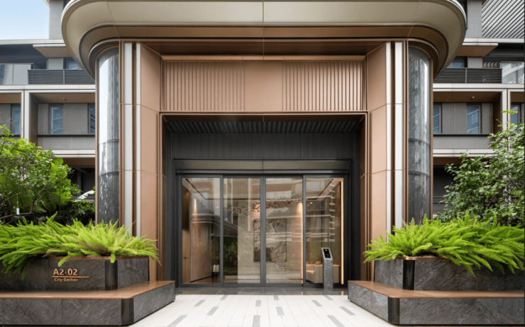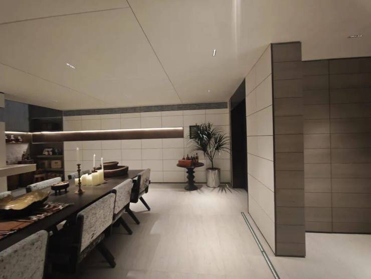 入户大堂,引入人脸识别系统,内部宽敞明亮,搭配高质感岩板、金属格栅和氛围灯,仪式感拉满。