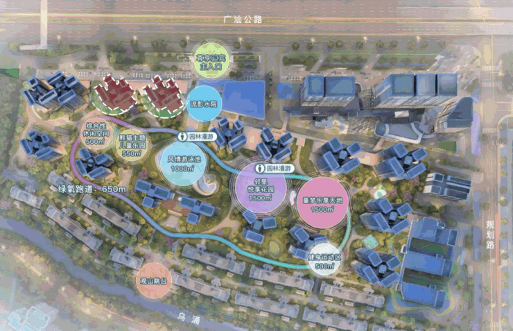 生活配套:自建约1.8万㎡商业街、自建幼儿园、游泳池等
