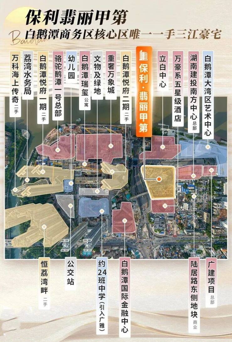 这一地块地处白鹅潭商务区核心区,三江交汇处,周边商业、交通、人文、教育、医疗配套一应俱全,在建的双重奢商业地标——广州万象城、聚龙湾太古里,未来必将为白鹅潭带来非凡体验。