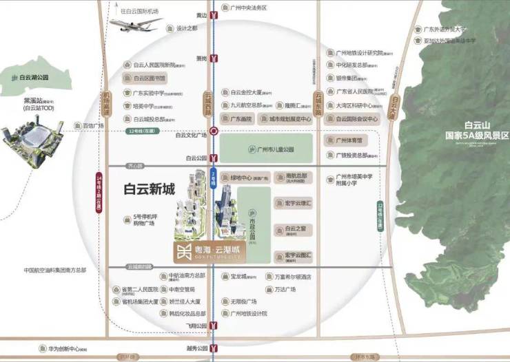项目紧邻广州儿童中心、白云国际会议中心等六大省市级地标建筑,南航三大总部、无限极总部、地铁设计院总院等总部大楼环绕在旁,共同构筑了一个高端、商务、国际化的生活圈层。