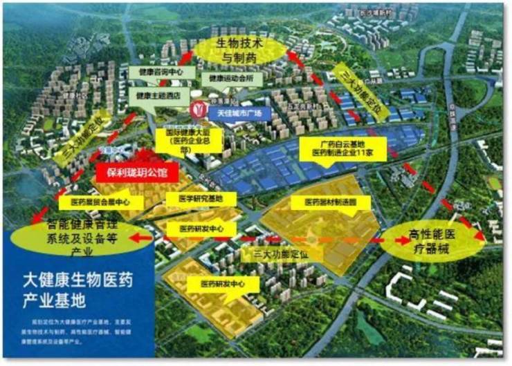 广州大健康产业基地:投资200亿,规模约等于22个广钢新城,已有何济公、明兴制、广药集团、和黄中药等29家知名健康产业企业入驻。健康城整体包含医药研制、职业教育、健康服务和健康养生四大功能片区。