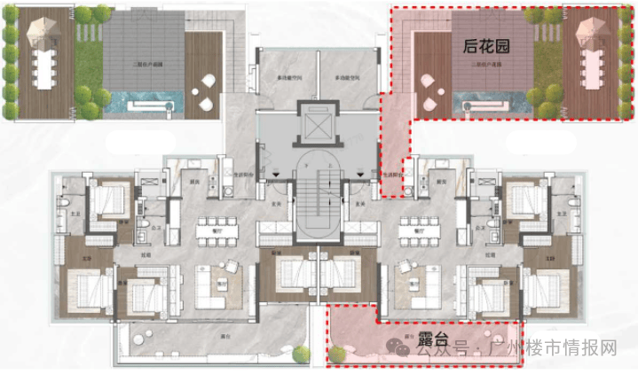 最后一个户型是是很多人喜欢的,4楼124㎡四房三卫,全广州独一份的可变复式户型。层高随便你设计,带顶楼专属花园,种花养鱼、喝茶赏月,能装下你所有的生活想象。