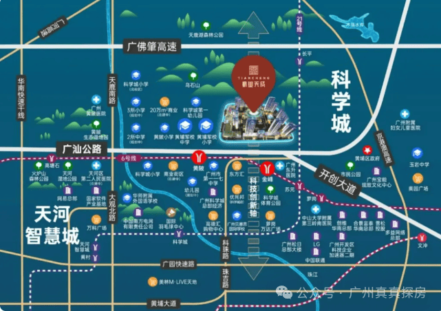 项目步行约1400米即6号线黄陂、金峰地铁站。除轨道交通外,保利翔龙天汇周边还有多维立体的高速网,北面紧靠广汕路,通过广园快速、广佛肇高速等“五横三纵”路网,畅达中心城区。正常自驾约20公里能到珠江新城,约17公里到琶洲。另外,项目就在科学城,沿着广汕公路,就可以转上开创大道,快速通达科学城企业总部区域。