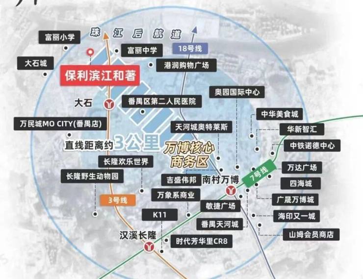 项目距离地铁3号线大石站约1.3公里,步行约19分钟,算上上下楼出小区门,大概会超25分钟,加上3号线大石站经常限流,排队进地铁,体验感一般吧,虽然去客村珠江新城不用换乘可以直达,如果买这里通过地铁通勤的话,建议买辆小电驴接驳地铁,坐上地铁,2站到长隆,3站到万博,4站到客村,6站珠江新城,自驾的话会方便很多,出门就是新光快速,不堵车的话,去珠江新城半个钟即可。