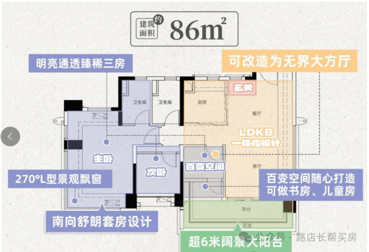 建面86平,三房两卫LDKB设计,南向景观大阳台,全屋动静分离,阳台连通次卧,约6.4米长,主卧带270度景观飘窗,总价266-310万左右。