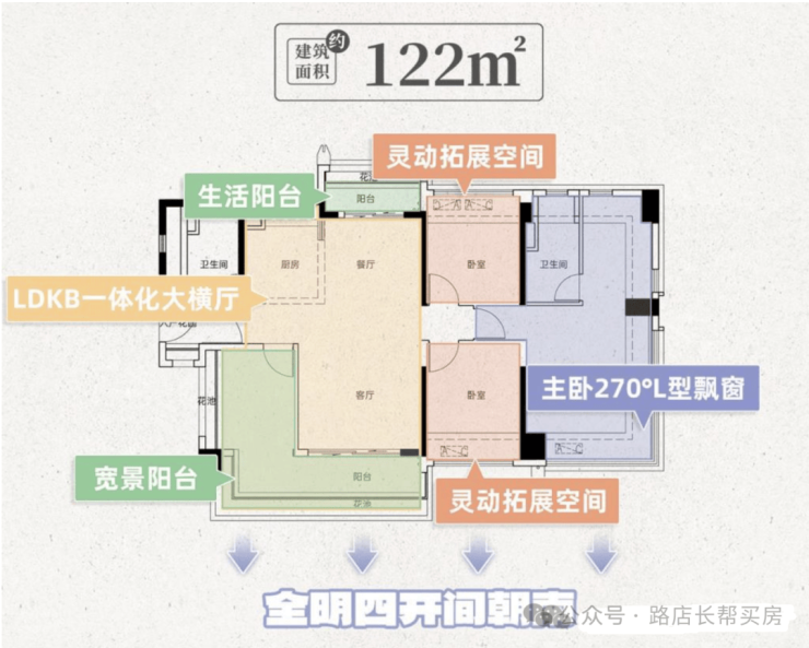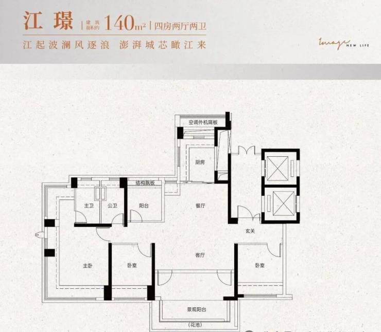建面142平四房两卫,南向四开间采光,LDKB一体化设计,该户型是板楼设计,专梯入户,南望园林,北向五开间都能北向望江,L型厨房,主卧C型270度景观飘窗,享受环幕江景景观,总价570万左右。