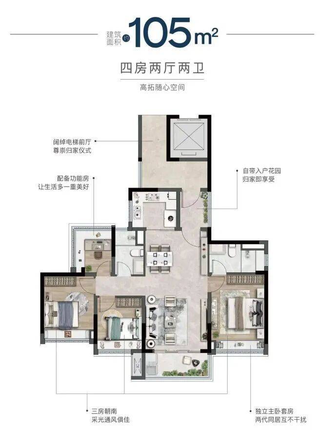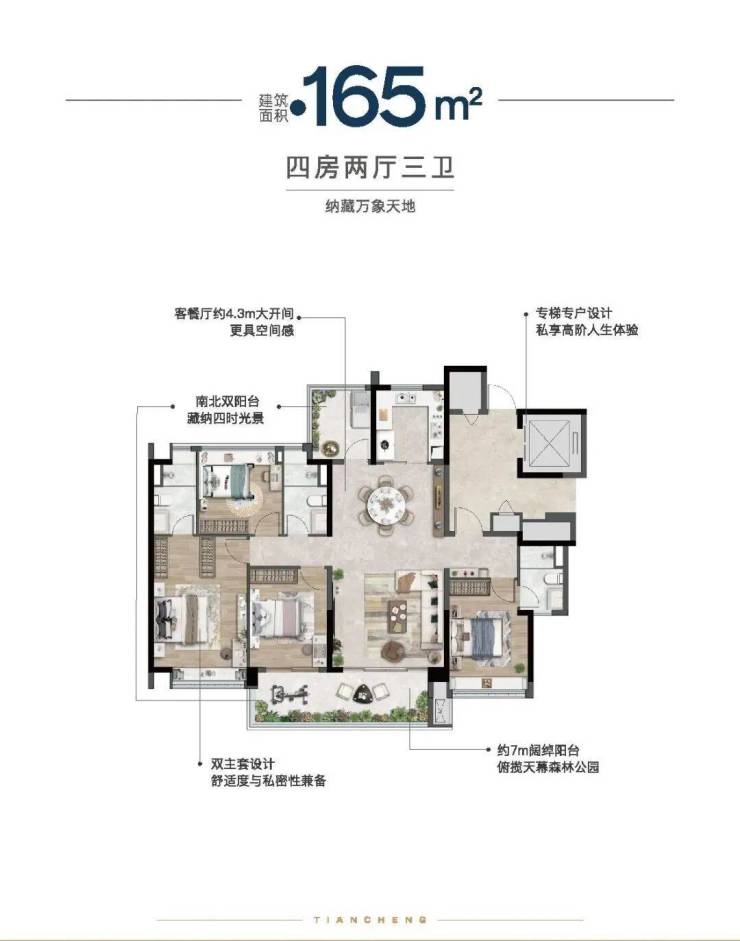 项目为低密度围合式小区,在售 106㎡、129㎡、168㎡三种四房户型,精装修交付。106㎡四房四开间朝南,带入户花园;129㎡四房有 U 型厨房、约 6.3 米大阳台;168㎡四房三卫有双主卧套房等。作为纯改善项目,产品设计贴合改善需求,品质较高。