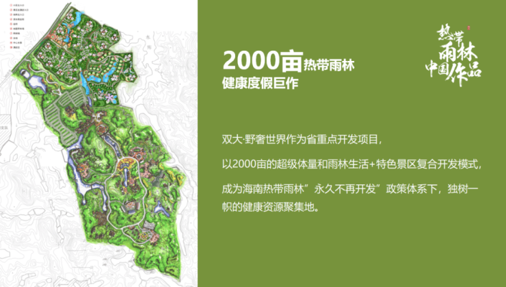 整个区域由一轴、两廊、三大空间构筑而成,打造野奢生活、野奢休闲、野奢游览三大立体组合生活空间,涵盖花园洋房、湖景公寓、温泉酒店、养生会所、沿湖风情商业街、热带雨林野奢世界旅游度假景区等综合业态配套。项目以约2000亩超级体量雨林生活开发建设,成为海南热带雨林“永久不再开发”政策体系下独树一帜的健康资源聚集地。