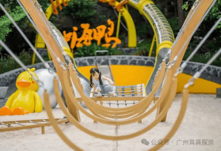 鹿鸣山公园,位于沙步大道旁,紧邻绿核大脚印公园。结合IP大黄鸭设计,以花园探险为主题,联动公交车站和山地公园,在山脚设置大黄鸭主题游乐场所,包括嗨鸭滑道、儿童游乐沙坑、登山步道、攀爬墙等趣味项目,让这里的孩子们在玩耍中成长。孩子们在滑道中呲溜滑下,随时感受在山上的飞驰与挑战。
