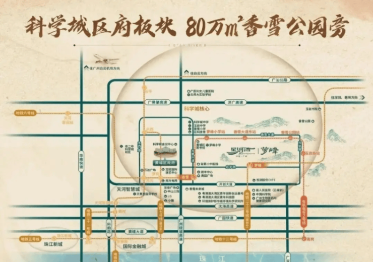 交通出行方面,项目紧邻广州地铁 6 号线香雪站,2 站到苏元站可换乘 21 号线,3 站就能抵达天河;