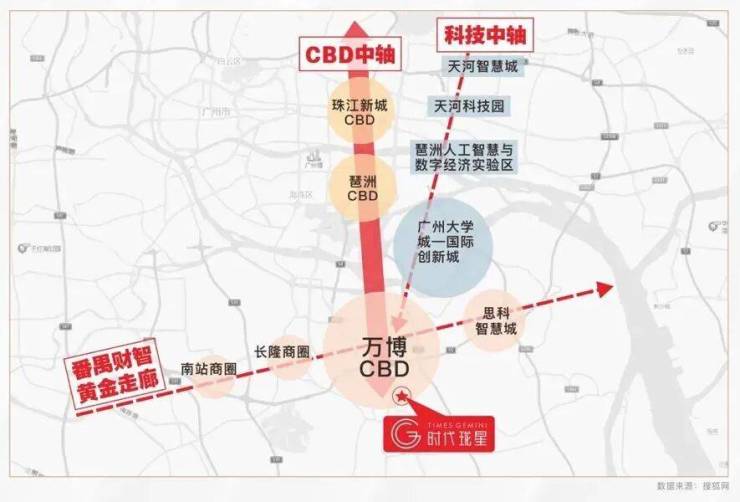 万博CBD在区位上位于番禺华南板块核心地段,北承珠江新城、琶洲会展中心、南接南沙自贸区,西连广州南站,占踞广州CBD中轴,广深港澳科技走廊与广深港高铁经济带双廊交汇的黄金C位,又属广州南拓轴与珠三角东西岸融合带核心,未来CBD价值不言而喻。