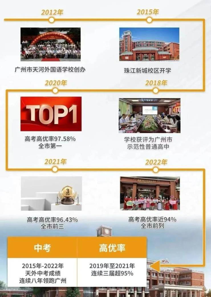 广州天河外国语学校自2012年4月创办以来, 学校迅速成长为广州优质教育品牌;同时享有北京大学大学先修课程实施学校、广州市教育工作先进集体等多项称号。