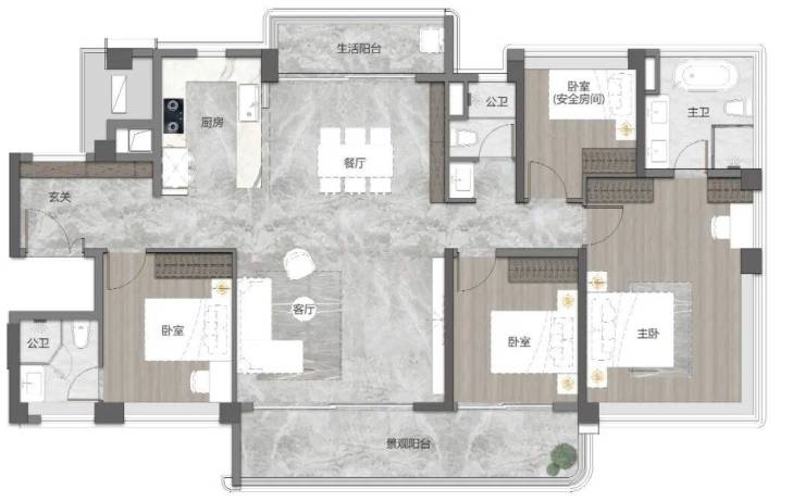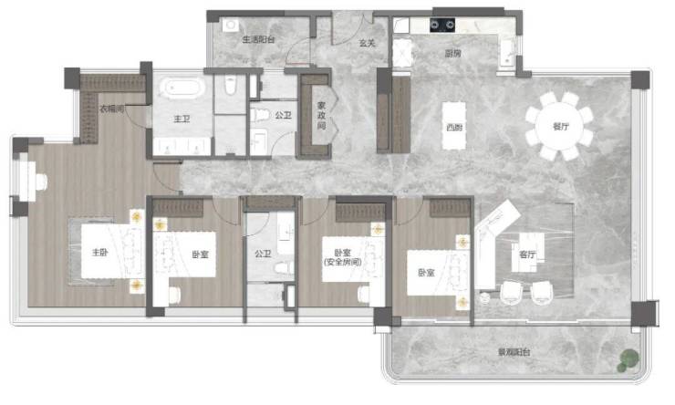 产品采用高低区组合模式,合理配置景观资源,打造双首层,加高架空层高度,使低区首层住宅即可观江;采用Y字形楼型,使产品面宽更大、观江视野无遮挡,改善对视;采用大宽厅设计,双面宽阳台,实现多面宽朝南,提升户内观景效果。