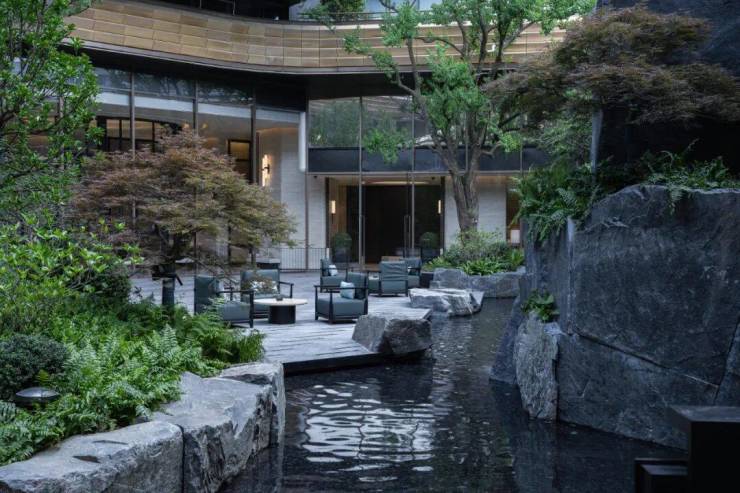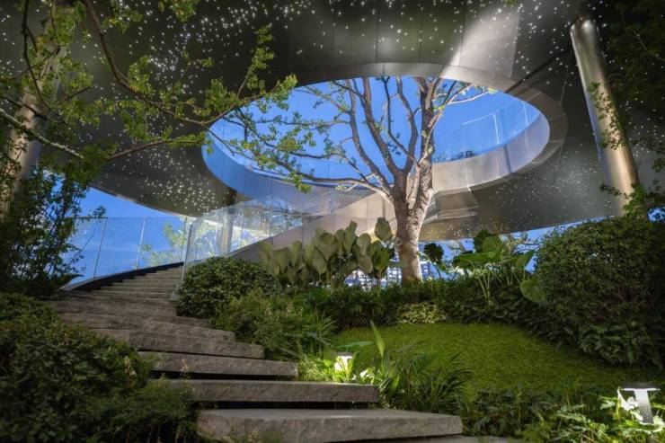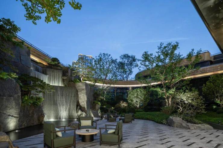 设计通过层层退台的空间布置形式,以游廊的方式串联起各层的功能分区,恒温泳池、健身空间、私宴厅……赋予生活更多的清新意趣。同时,将传统园林的空间手法转移到公区内部,让建筑在自然中自由延伸,带来移步异景的多维视觉享受;迂回的游园动线,也在有限的空间中,丰富了社交和休闲的场所与体验。立体灵动的游园系统,创造出一种山水交融的社区环境,也保障了社区的私密性和安全性。