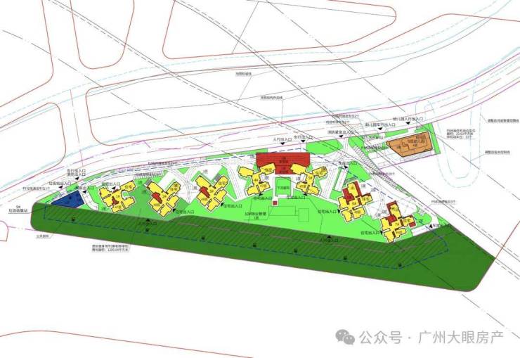 地块本身形状不算规则,像个剪刀叉,6.7万平的土地面积,只有3万平可用于建设,剩余1.7万平道路用地,2万平绿地用地,坊称海珠版“兰亭盛荟”