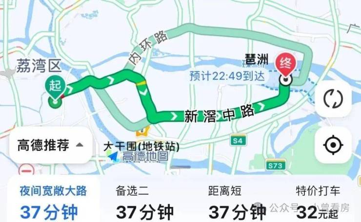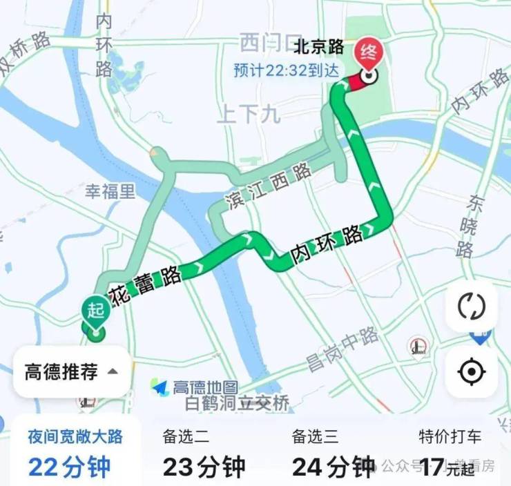 自驾去北京路:出小区上花蕾路转洲头咀隧道,再上内环至江南大道,全程8.4公里,耗时22分钟,这是不堵车的情况下,上下班内环会堵车,通勤时间会拉长。