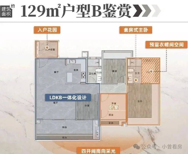 约129㎡户型B,四开间南向采光,客厅开间最高约达6米!搭配同为约6米的阳台,室内空间感直接撑大至IMAX级尊享!LDK餐客厅一体化,厅卧即可合并做成无界大方厅,也可以灵活设计成两个多功能间或次卧。