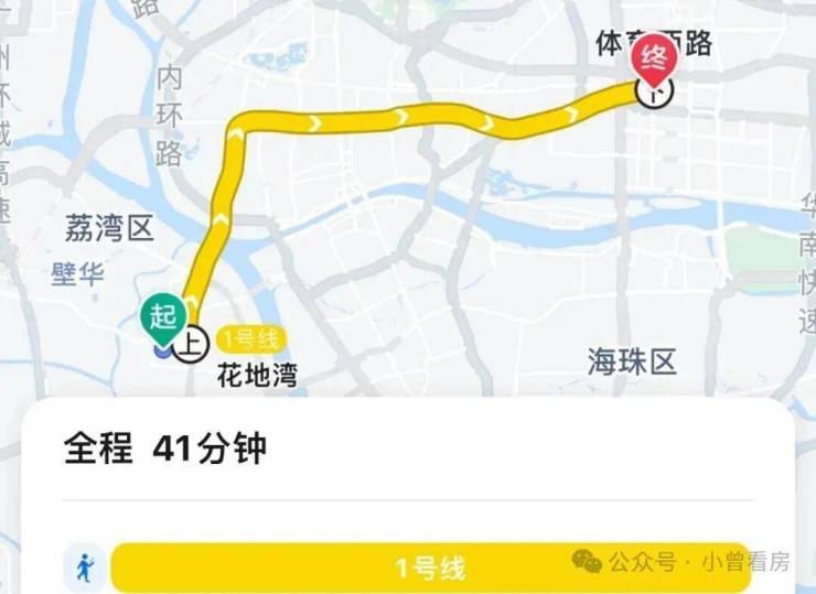 地铁去往珠江新城:步行至地铁,1号线直达体育西路,全程11个站,耗时41分钟。