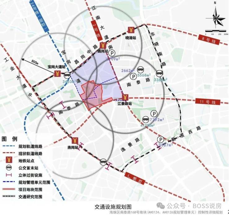 位置交通:地块位于海珠区南泰路168号,东临柏涛雅苑,西至宝岗大道。周边环绕地铁2号线、8号线、11号线及广佛线,临近江泰路站、宝岗大道站、昌岗站等,步行约300米可达宝岗大道站,约400米至江泰路站。
