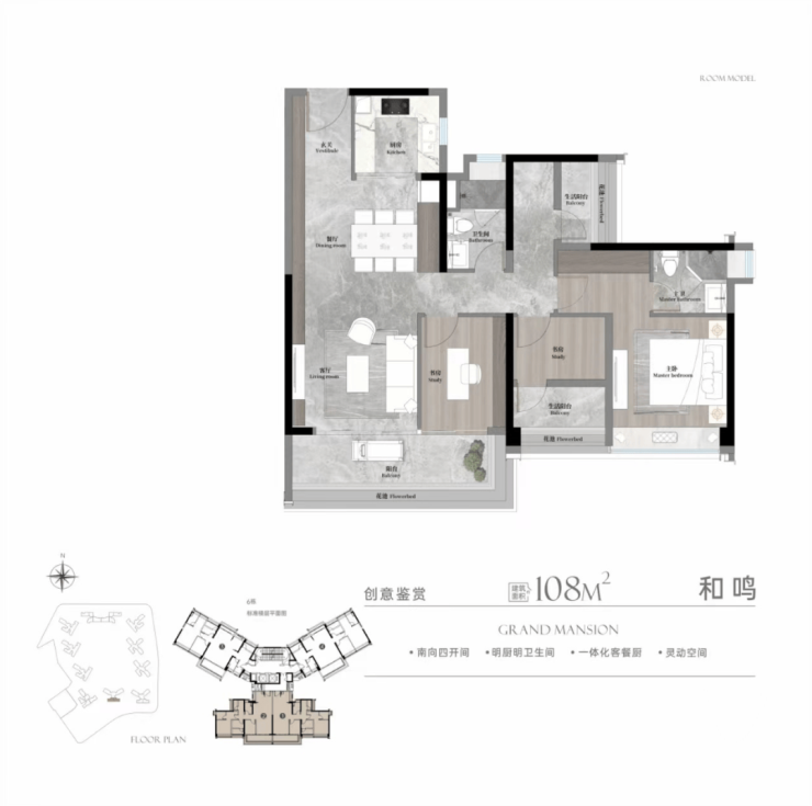 建面108㎡3居:780-840万,2梯4户,层高3.00米,总楼层28-30F;