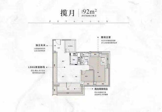 92㎡四房实现 LDKG 一体化布局,约 6.4 米南向阳台与步入式衣帽间提升居住舒适度;