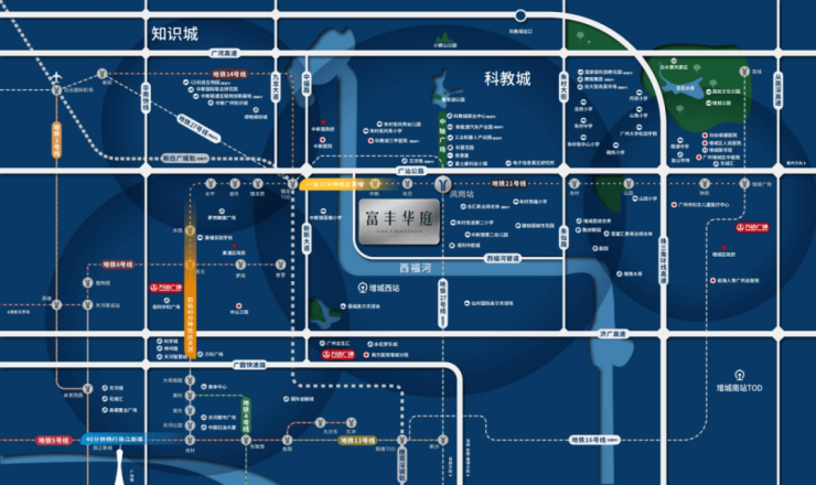 项目位于广州市增城区朱村街,广州地铁21号线凤岗站A出口附近;坐落于广州科教城(万亿级湾区科创走廊核芯的千亿科教城),投资1800亿,规划打造为国际一流教育聚集区和职业教育高地。