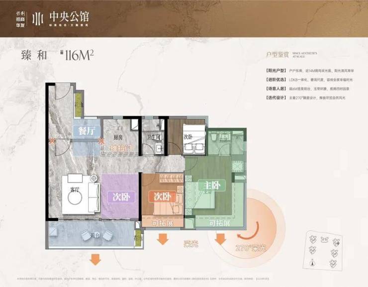 其中,该户型标配270°飘窗采光更佳,L型衣帽间更有120平以上户型的收纳功能。