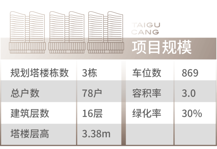 太古仓壹号整体项目总建筑面积约8.5万平方米,主体结构塔楼3栋共16层、裙楼3层、商业独栋7幢、地下3层配备近900个标准车位,商业与塔楼业主出入口完全阻隔,私密性一流。