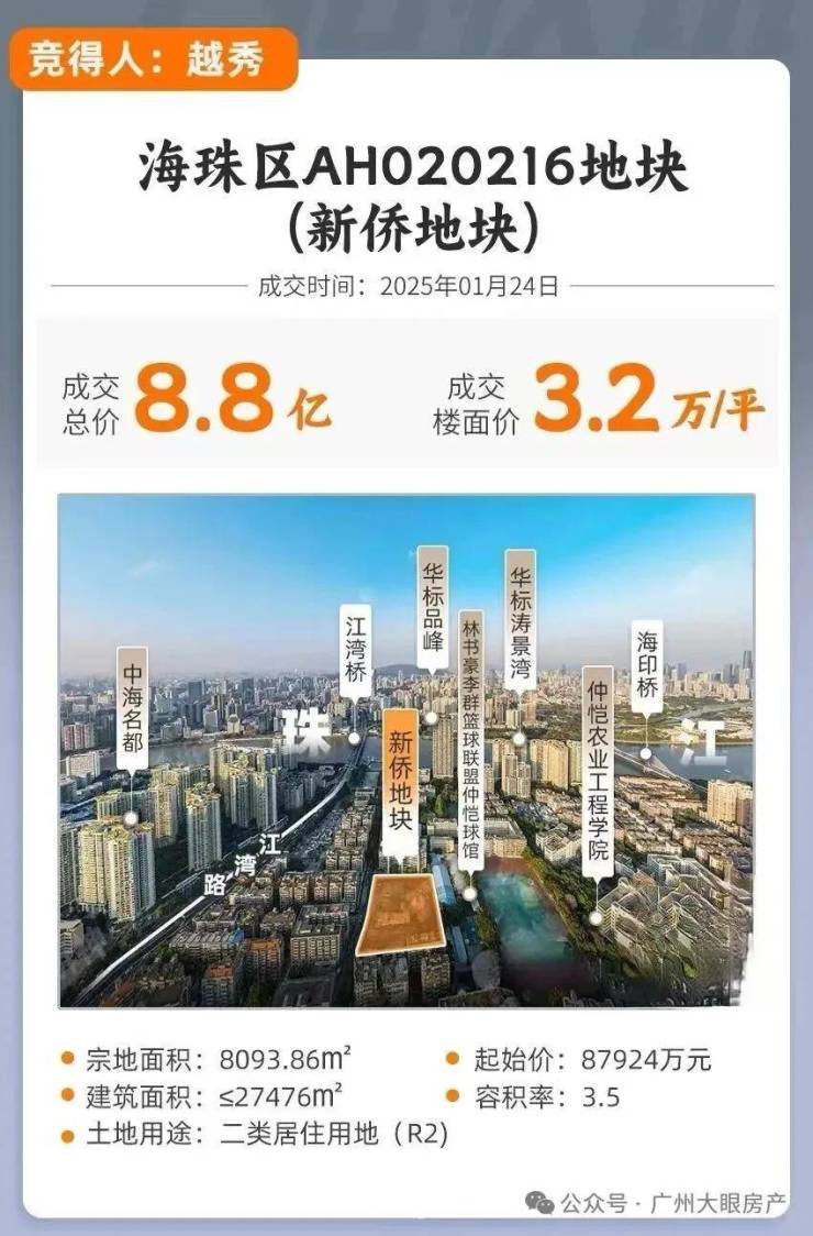 2025年1月24日,2025年广州首宗宅地---海珠滨江中AH020216地块,即江湾路以西地块,又称新侨地块,被越秀以底价近8.8亿的总价、3.2万/㎡的楼面价拿下。