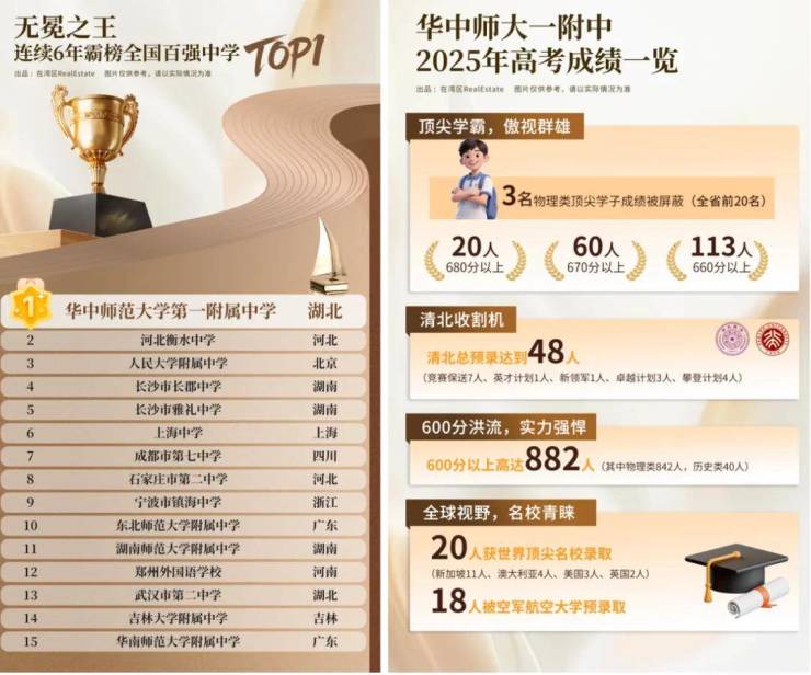 同源全国性知名学府华中师大一附中,2023年高考一本上线率近100%,2024年600分率攀升至96%,清北录取人数超60人,清北录取率7%以上,被誉为“清北摇篮”,为区域带来优质教育。