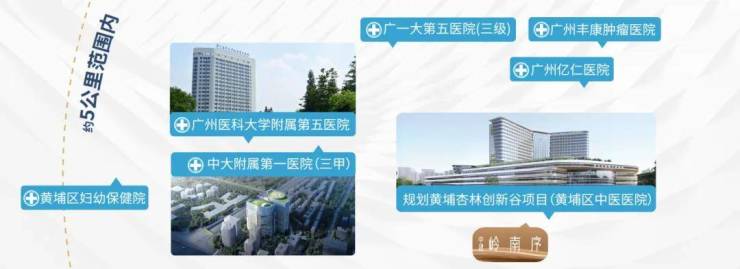 医疗方面,约5公里范围内多家三甲医院环绕:黄埔区中医医院(三甲,建设中),距离项目约500米(数据来源:百度地图直线实测),打造黄埔区首个国家级中医药领域示范高地;中大附属第一医院东院区(三甲);广州医科大学附属第五医院(三甲)等。