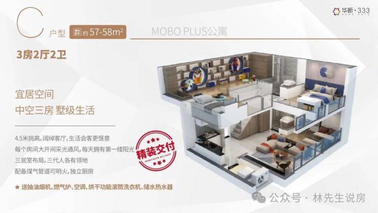 明火厨房:58㎡及以上户型配备燃气管道,采用防污玻璃隔断设计,兼顾中式烹饪与空间通透性
