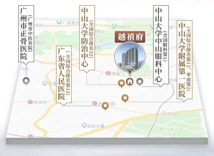另外越秀区还是很多全国都知名的三甲公立医院,该项目不少最顶尖医院更在项目5分钟生活圈内。这里不止有3家全国前50名医院,还有国内“眼科第一”的中山眼科中心