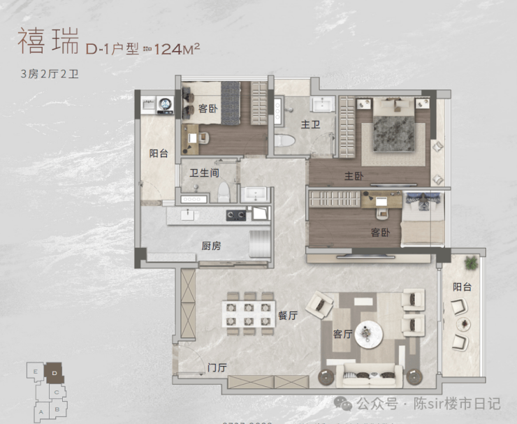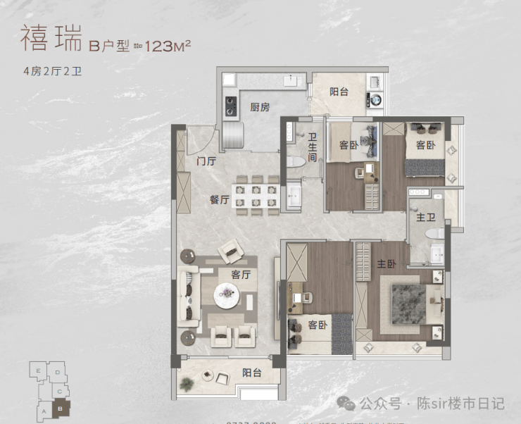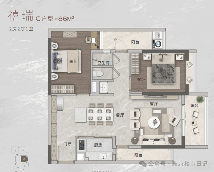 在售户型是86㎡、100㎡、104㎡、118㎡、123㎡、124㎡和148㎡共五款户型,都有双阳台的配置,卧室带飘窗或相连阳台,门厅有储物的空间。