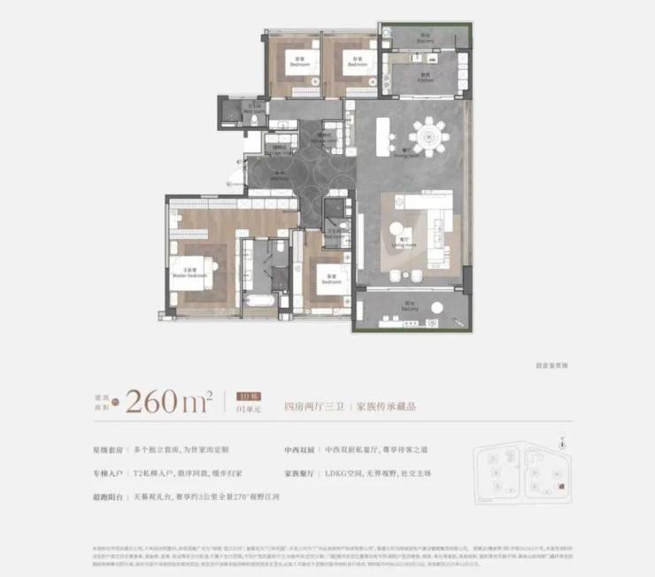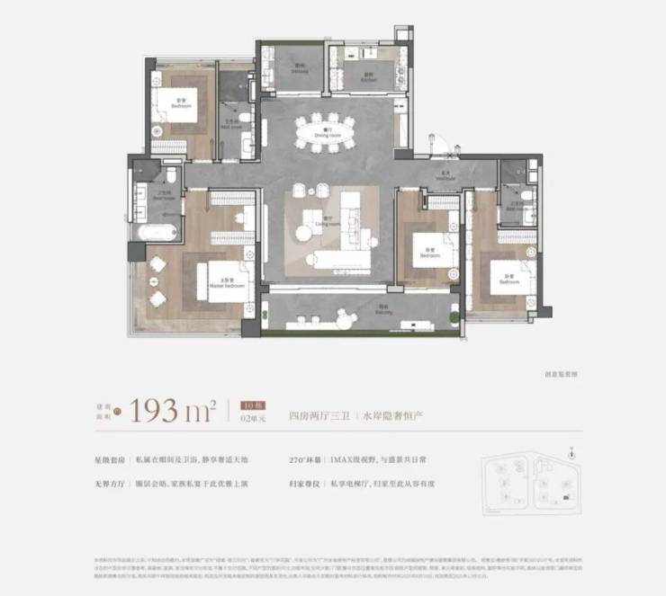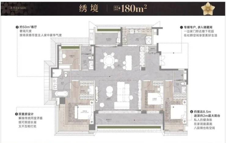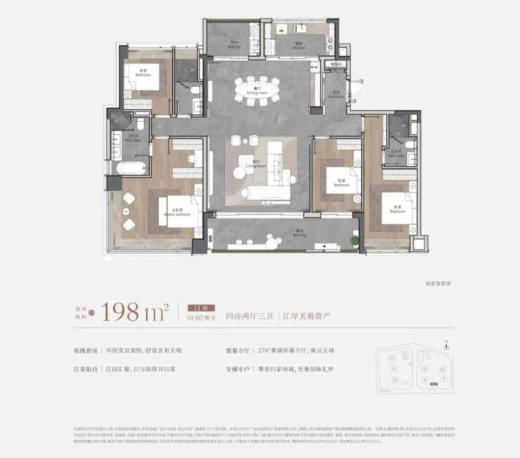 户型设计方面,主力户型为建面约110-260㎡的四房,注重空间利用与功能分区。部分户型采用两梯两户设计,实现南北对流,使用率超过100%。部分户型还配备双厨、独立衣帽间及步入式储藏间,满足家庭的多元居住需求。装修标准方面,选用香格里拉翡翠岩板、维多利亚玉石、铸铝防火装甲入户门、全屋日系中央空调及净水系统等高端配置,细节处彰显精致与品质。