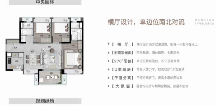 此外,小区融入“月、泉、风、云、山”自然五蕴的设计理念的约2万平主题园林,也通过围合式的空间布局,保证景观最大化利用。