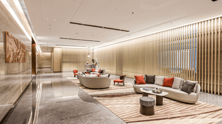 穿过林荫夹道,就来到了中心会客厅,沿着旋转楼梯可以直接通往庭院生活馆。