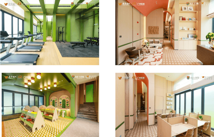 越秀·大学城(二期)的11栋架空了二楼、三楼,设计为人文会所,未来可能会推出更多的人文活动,此外还有棋艺室、健身房、儿童玩耍房、小区中间的麦穗乐园等,供业主娱乐。