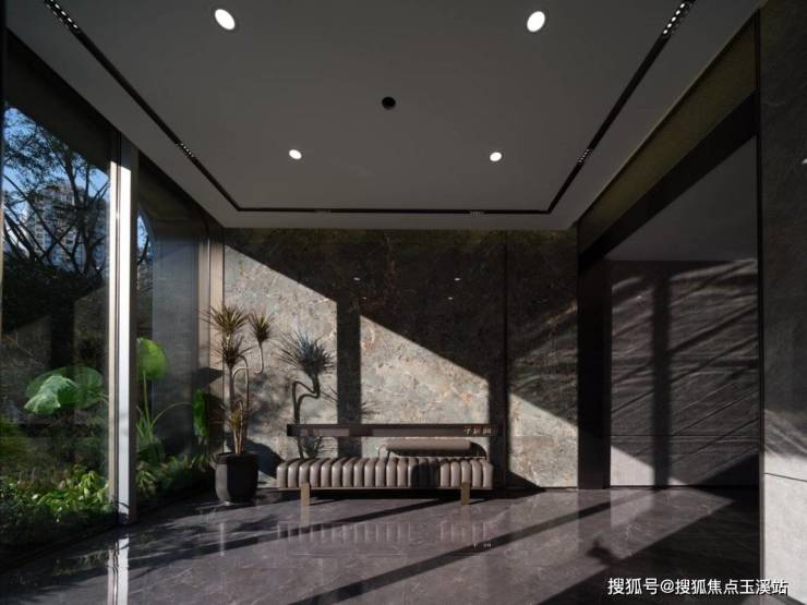 天花金属(格栅+局部镂空铝板)+专属项目 LOGO,地面划线,天地呼应,归家极致昭示性与仪式感,大面宽玻璃门,增强归家空间通透性