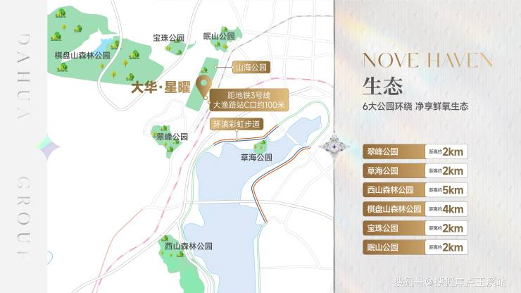 翠峰公园、草海公园、西山森林公园、棋盘山森林公园、宝珠公园、眠山公园六大生态公园环伺。